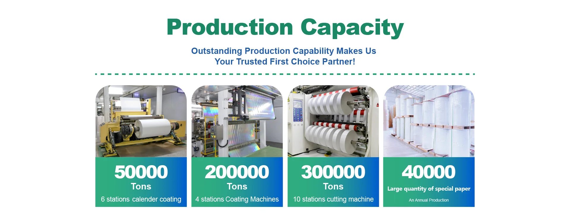 주요 제품:접착 라벨 소재 점보 롤, 세미 광택 라벨, 열 라벨, 잉크젯 용지 라벨, 매트 또는 광택 화이트 PP 라벨 또는 BOPP 라벨
